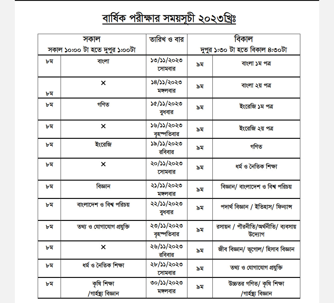 বার্ষিক পরীক্ষার সময়সূচী ২০২৩ খ্রিঃ