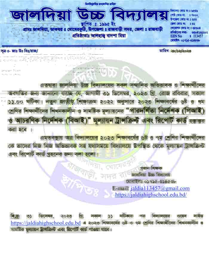 এতদ্বারা জালদিয়া উচ্চ বিদ্যালয়ের সকল সম্মানিত অভিভাবক ও শিক্ষার্থীদের অবগতির জন্য জানানো যাচ্ছে যে, আগামী ৩১ ডিসেম্বর, ২০২৩ খ্রি. রোজ রবিবার, সকাল ১১.০০ ঘটিকা। নতুন জাতীয় শিক্ষাক্রম ২০২২ অনুসারে ২০২৩ শিক্ষাবর্ষের ৬ষ্ট ও ৭ম শ্রেণির শিক্ষার্থীদের শিখনকালীন ও সামষ্টিক মূল্যায়নের “পারদর্শিতা নির্দেশক (পিআই) ও আচরণিক নির্দেশক (বিআই)” মূল্যায়ন ট্রান্সক্রিপ্ট এবং রিপোর্ট কার্ড হস্তান্তর করা হবে ।